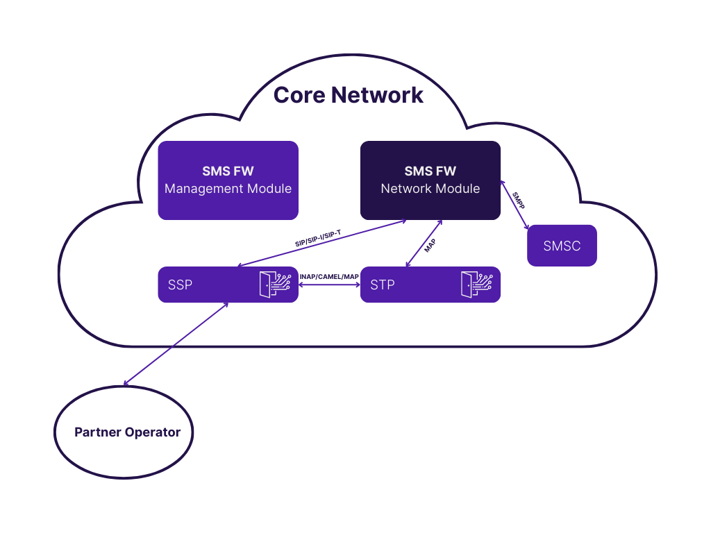 It’s a real-time messaging security system that monitors and controls all SMS traffic entering operator networks. It scans messages through MAP (SS7) and SMPP interfaces, applying intelligent detection rules to identify fraud before delivery.