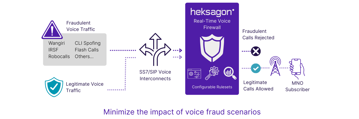 - Heksagon Voice Firewall (VFW) is a carrier-grade solution designed to actively prevent unauthorized and fraudulent voice traffic at the network core. Unlike traditional post-event detection systems, VFW operates in real time, analyzing every call during the setup phase and applying dynamic, scenario-based rules to block or degrade suspicious traffic before it connects.